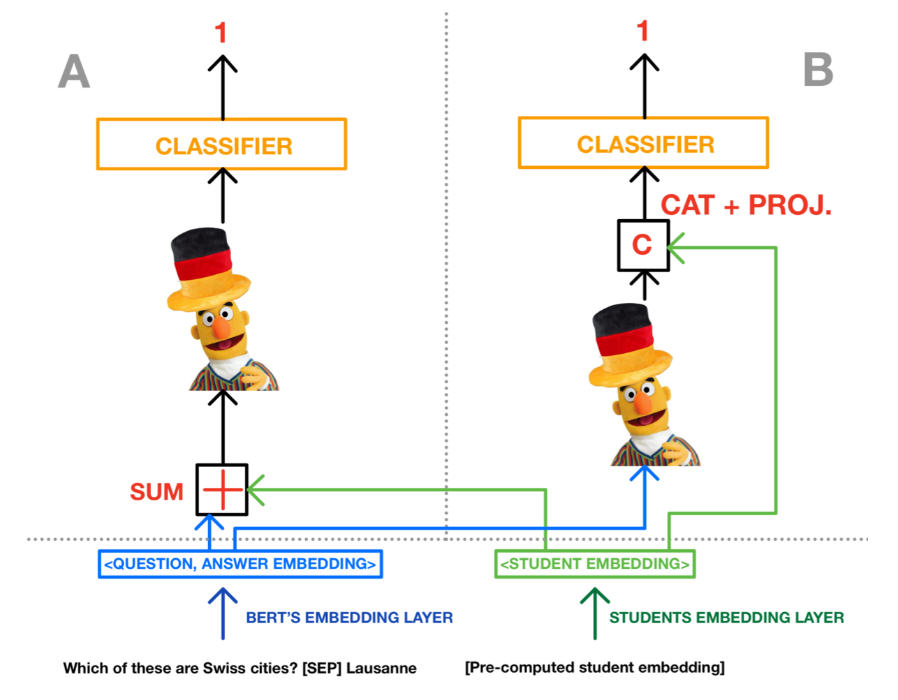 We explore two integration strategies that inject student context into a BERT-based answer predictor: