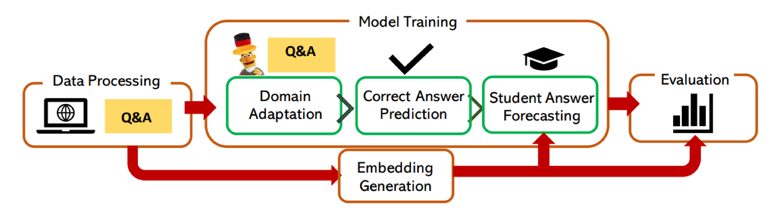 Only after learning correct-answer structure, we inject student embeddings and fine-tune for answer-choice forecasting.