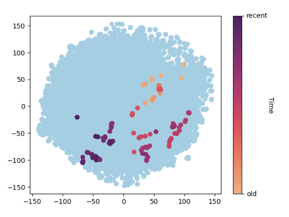 To make the student representations more interpretable, we visualize embeddings over time using t-SNE. One striking pattern is that a single student’s embedding often evolves smoothly as they answer more questions, suggesting that the representation captures a moving “state” rather than a static profile.