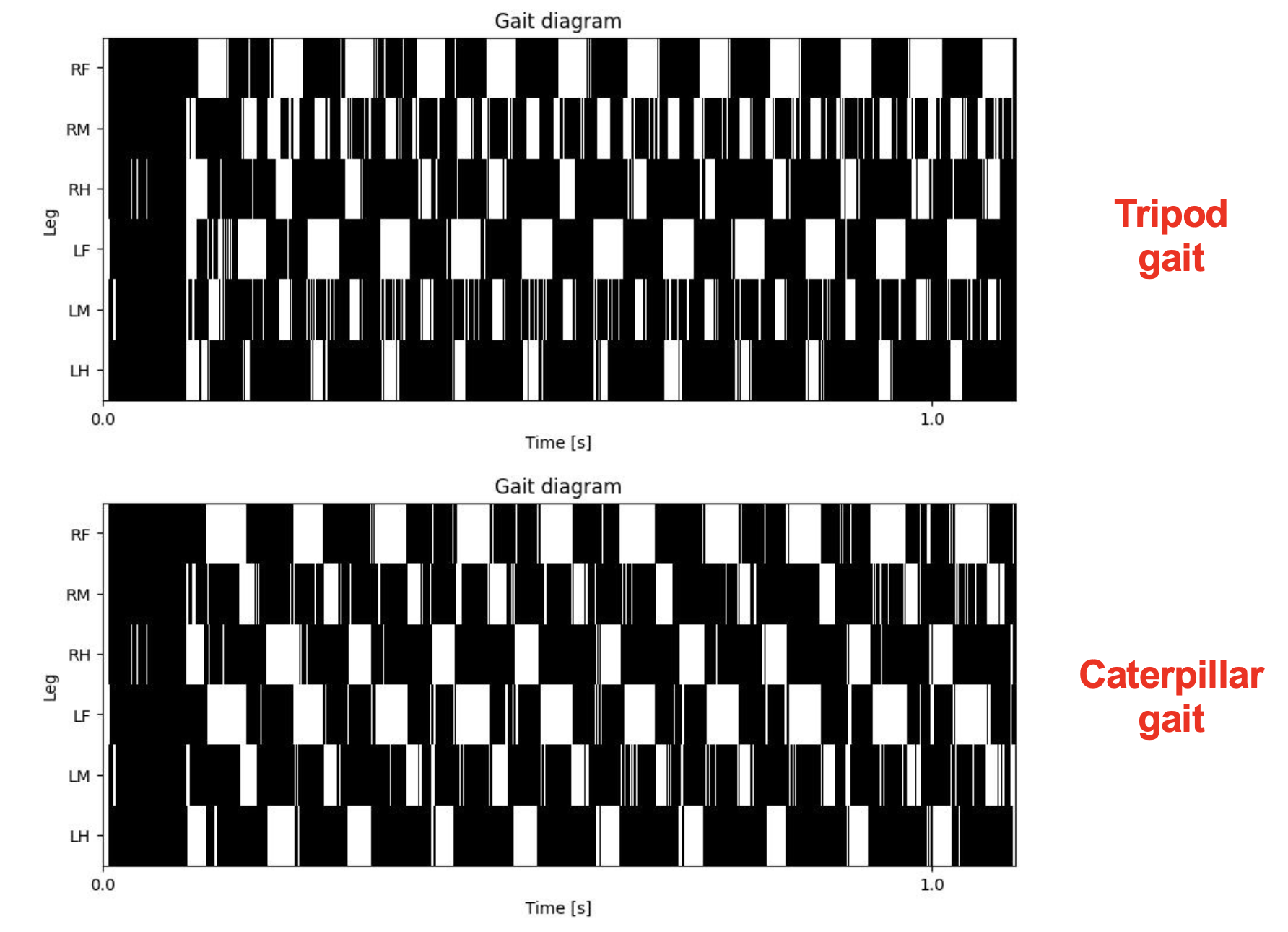 - Caterpillar gait: wave-like pattern with four legs on the ground most of the time, which proved more robust on rough and gapped terrain.